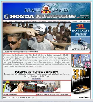 Hybrid HTML / Flash event website for surf competition featuring Kelly Slater and Andy Irons sponsored by Honda and O'Neill complete with schedules, events, media, merch as well as handling inbound inquiries.